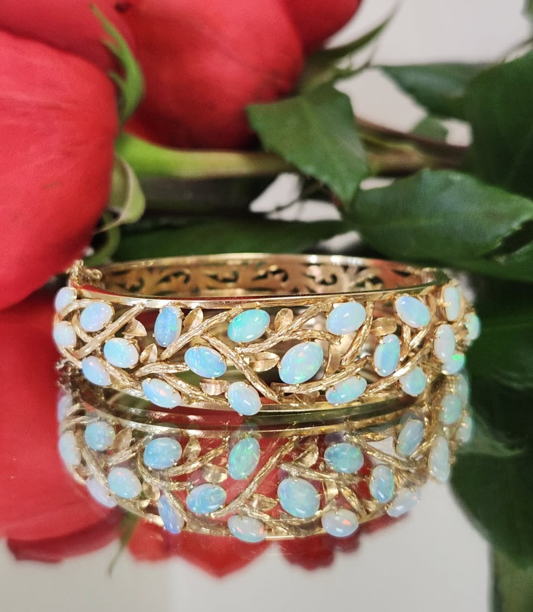 Ancient Romans thought that opals were the most precious of all stones because they contained all colors. Is there anything more amazing than the explosion of color that high quality opals flash? They’ve been prized throughout history for this unique property. Ever wonder what gives opals that flash of a kaleidoscope, that play of color? Opals are made of silica, which is a water based substance that forms in the cracks of rocks. Over time the water evaporates, leaving the silica to form round crystals. When the crystals grow, they create patterns which reflect light like rain through a rainbow. Not all opals show their rainbow brights. Common opal, or opal without the play of color, can be found in beautiful opaque colors like creamy pink, denim blue and even teal green. There’s also Mexican fire opal, which can be a transparent bright orangey red. Because opals contain water, they can be easily damaged if they dry out or are exposed to direct sunlight for long periods of time. In fact, dryness in an opal can cause it to crack and loose its phenomenal color. Properly mined opal is stabilized for ten or more years before it is cut so that it can acclimate to its new environment above ground. Opals are by nature soft stones, so while you often see them in rings, they are almost always cabochons, or rounded tops instead of faceted. That keeps edges from chipping or breaking. They are also usually set low in jewelry. As the month of October brings a world of new fall color around us, what a perfect stone to celebrate that fire!