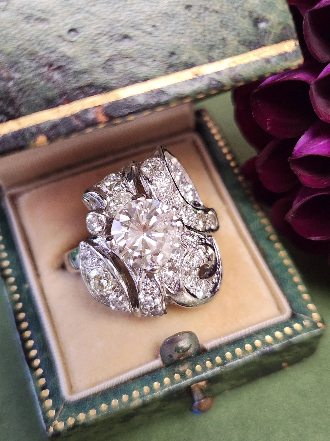 The ultimate in vintage cocktail rings- This sparkle bomb ring features a center round brilliant cut diamond weighing 1.81ct (H/SI1, GIA cert in pics). Swirls come around and beside the stone, encrusted in further round brilliant cut diamonds. There are 23 of the accent diamonds, ranging from 2.2 to 2.6mm, adding a total of approximately 1.26cttw in addition to the center, bringing the ring total diamond weight to 3.07cttw. The accent stones range in color but on average are G/H and VS2 clarity. The ring is crafted in heavy platinum (partial stamp) and weighs a hefty 11.90g. From front to back it measures 20.02mm. The ring is currently a size 7.75 and can be resized before shipping.