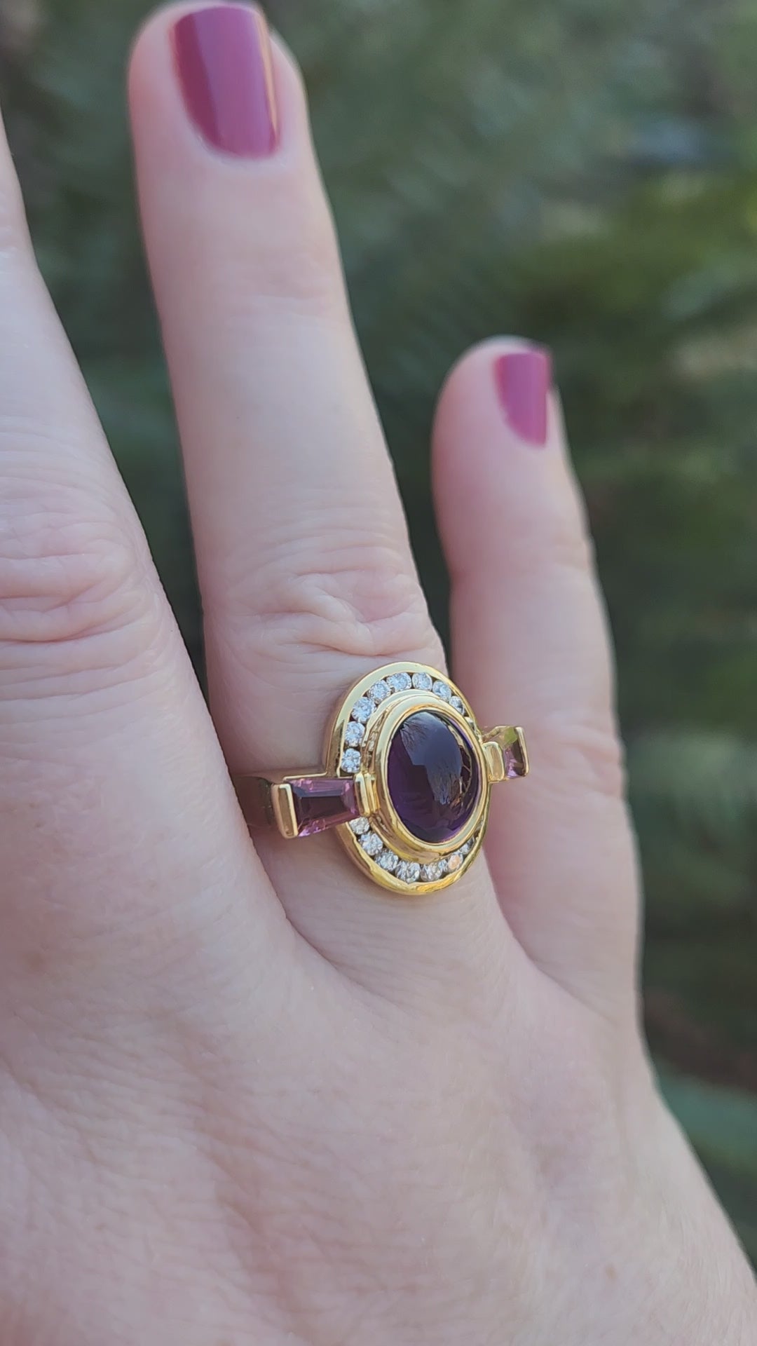 This gorgeous ring has all of the color and sparkle a girl could want! The ring features a center amethyst cabochon that is bezel set. The stone measures about 9.50 x 7.71mm, (over a carat) and is faceted on the bottom. On the top and bottom are channel set bright white diamonds measuring 1.7mm (0.02ct each) for a total diamond weight of 0.36cttw. The pink tourmalines on the shoulders provide beautiful balance to the ring and add about a quarter carat of gemstone weight. From front to back the ring measures 16.91mm. It is crafted in 18k and weighs 10.9g. The ring is currently a size 7 and can be resized before shipping for a fee, please ask for a quote in your size before placing your order.