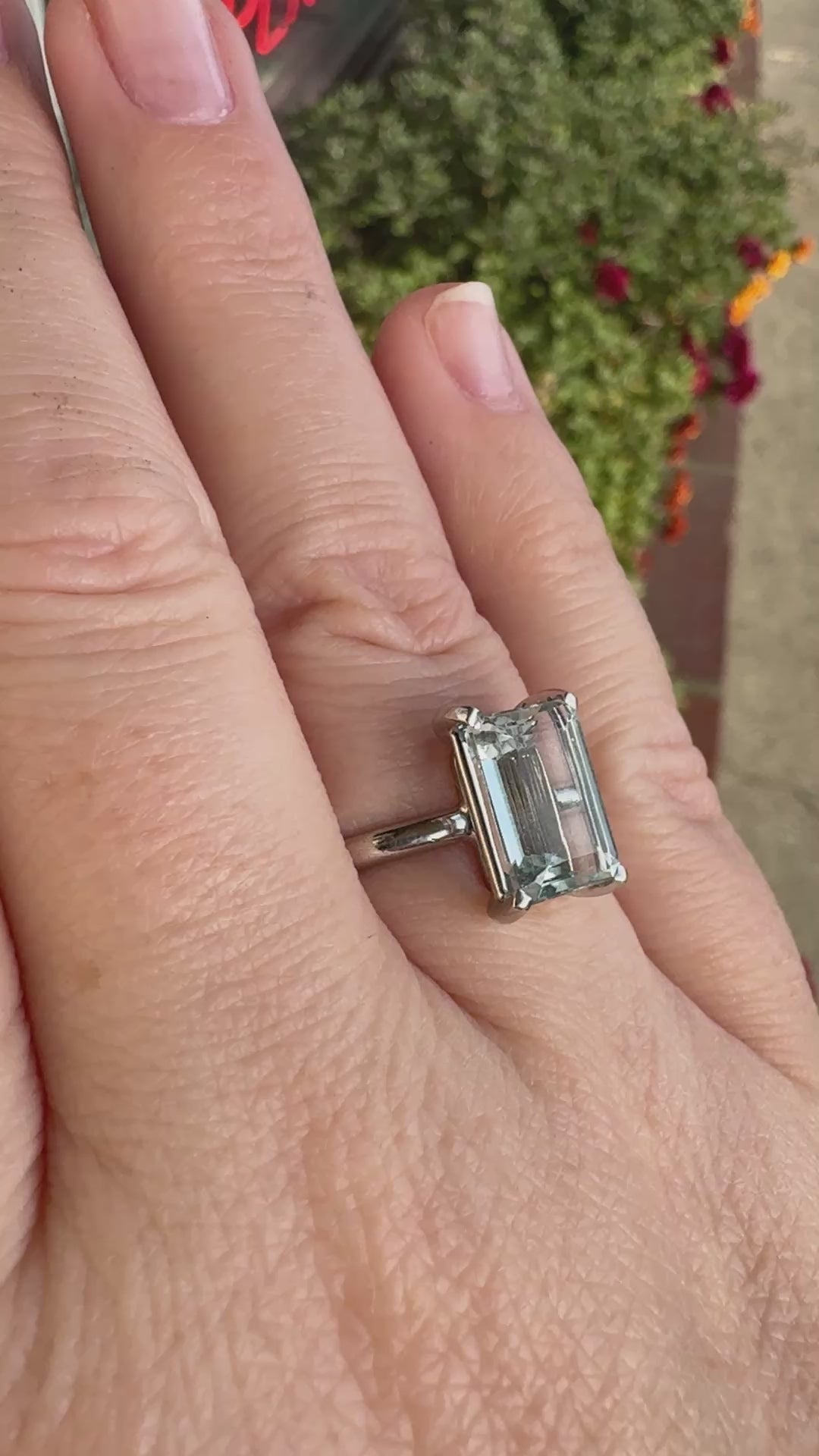 Vintage Emerald Cut Aquamarine Solitaire Ring in 18k White Gold