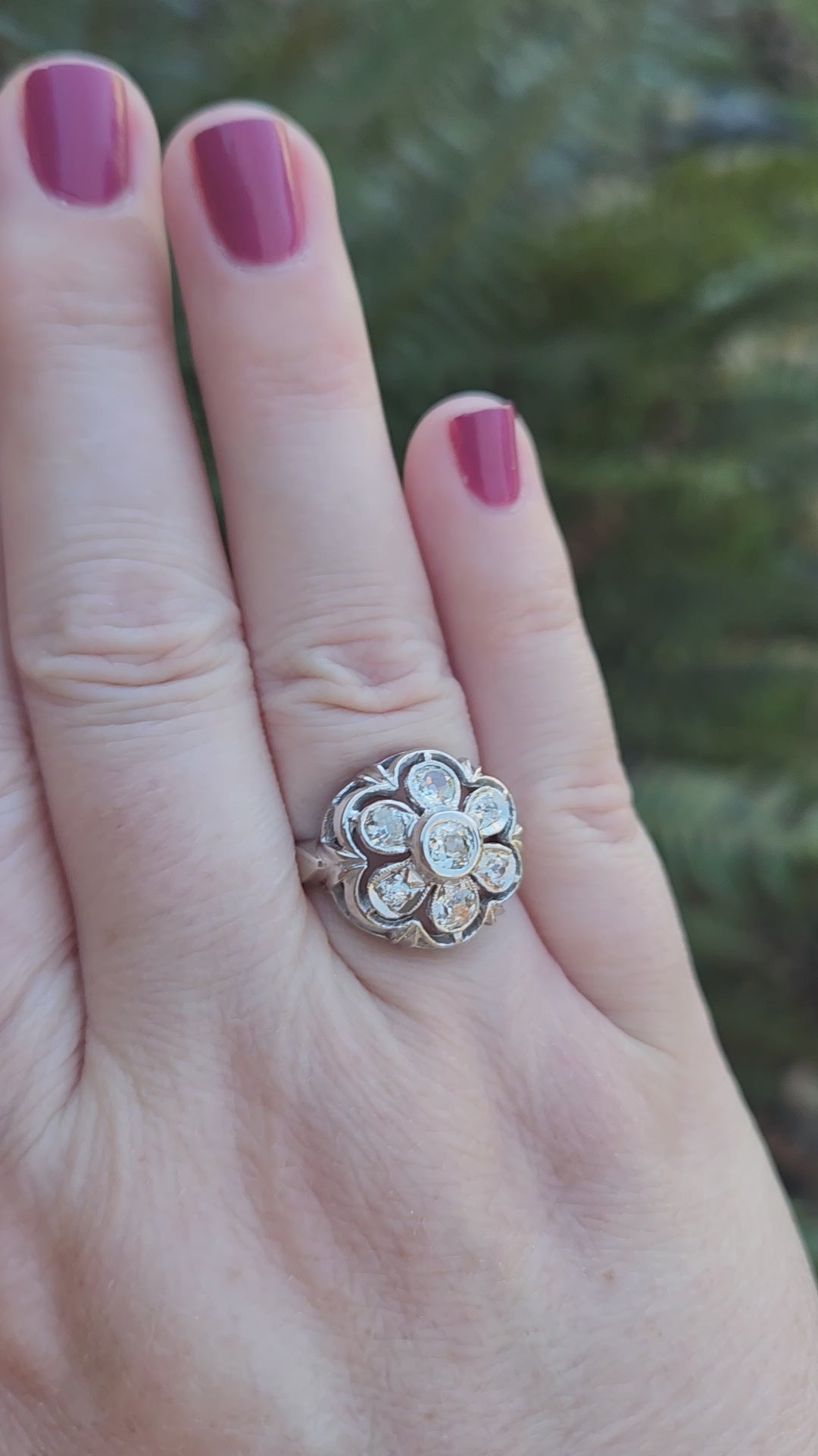 Vintage Old European Cut Natural Diamond Daisy Ring in 14k White Gold
